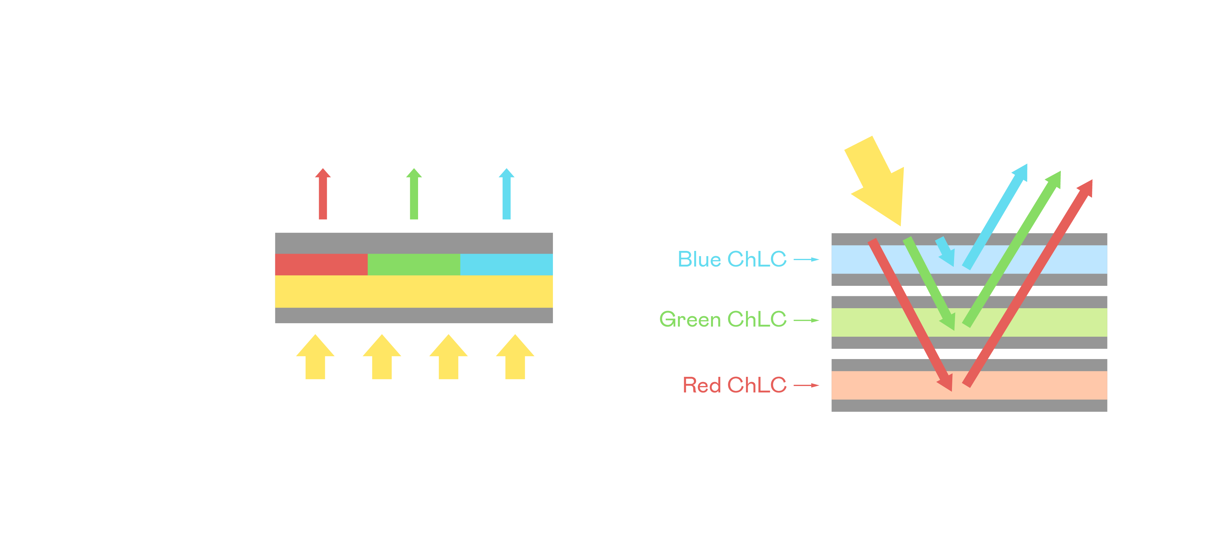 不凡成就非凡膽固醇液晶顯示器是由紅、綠、藍三層膽固醇液晶面板堆疊而成,並採用無彩色濾光片設計,減少環境光在反射過程中的損耗。